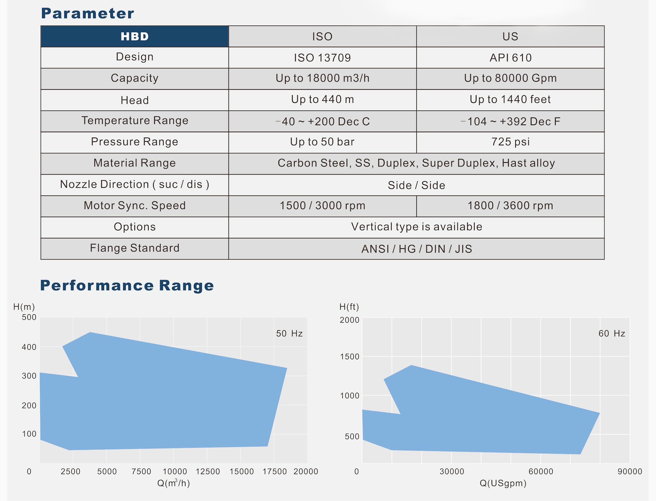 BB1, тип HBD е помпа между лагери, едностъпална, близо до централната линия, поддържаща помпа с двойно засмукващо работно колело, отговаряща на API 610. Хидравличната производителност се основава на международен усъвършенстван модел с висока ефективност.